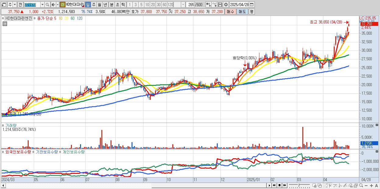 - HD현대마린엔진 (37,700원 ▲ 2.59% , 시총: 12,788억, 거래량: 764,190, 거래대금:290억, KOSPI)