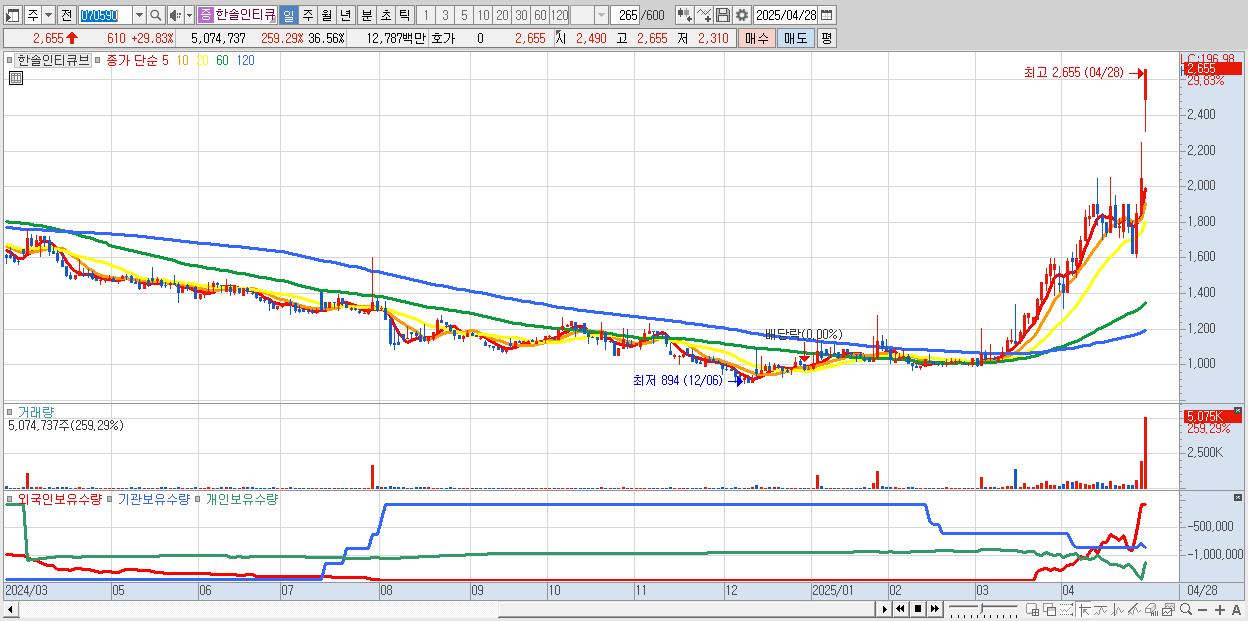 - 한솔인티큐브 (2,655원 ▲ 29.83% , 시총: 369억, 거래량: 5,074,737, 거래대금:128억, KOSDAQ)