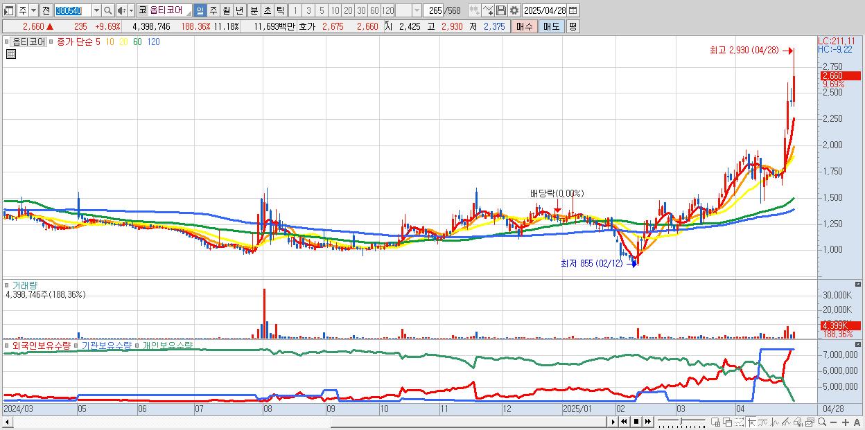 - 옵티코어 (2,660원 ▲ 9.69% , 시총: 1,046억, 거래량: 4,398,746, 거래대금:117억, KOSDAQ)