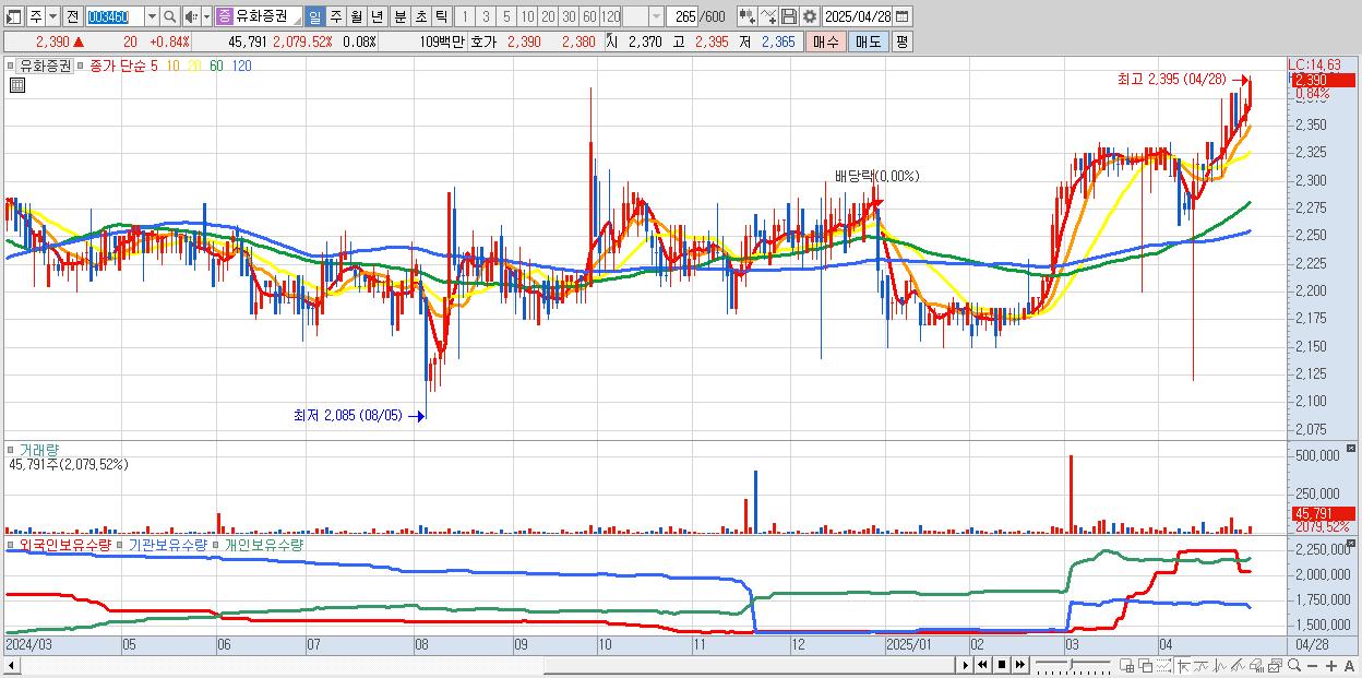 - 유화증권 (2,390원 ▲ 0.84% , 시총: 1,355억, 거래량: 45,791, 거래대금:1억, KOSPI)