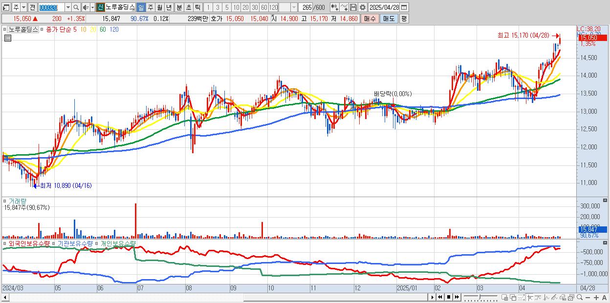 - 노루홀딩스 (15,050원 ▲ 1.35% , 시총: 2,000억, 거래량: 15,847, 거래대금:2억, KOSPI)
