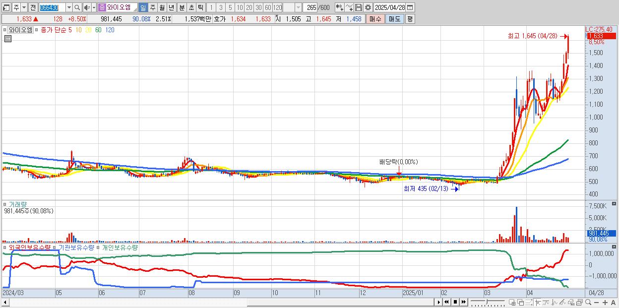 - 와이오엠 (1,633원 ▲ 8.5% , 시총: 639억, 거래량: 981,445, 거래대금:15억, KOSDAQ)