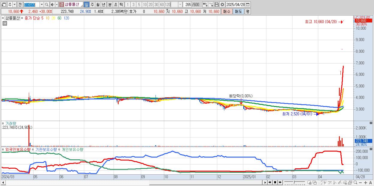 - 삼륭물산 (10,660원 ▲ 30% , 시총: 1,612억, 거래량: 223,748, 거래대금:24억, KOSDAQ)