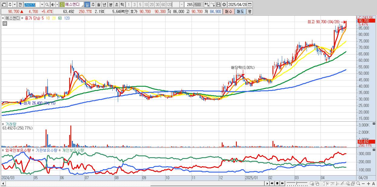 - 에스앤디 (90,700원 ▲ 5.47% , 시총: 2,624억, 거래량: 63,492, 거래대금:56억, KOSDAQ)