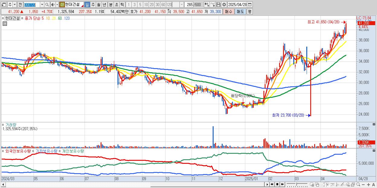 - 현대건설 (41,150원 ▲ 4.57% , 시총: 45,823억, 거래량: 1,002,607, 거래대금:412억, KOSPI)