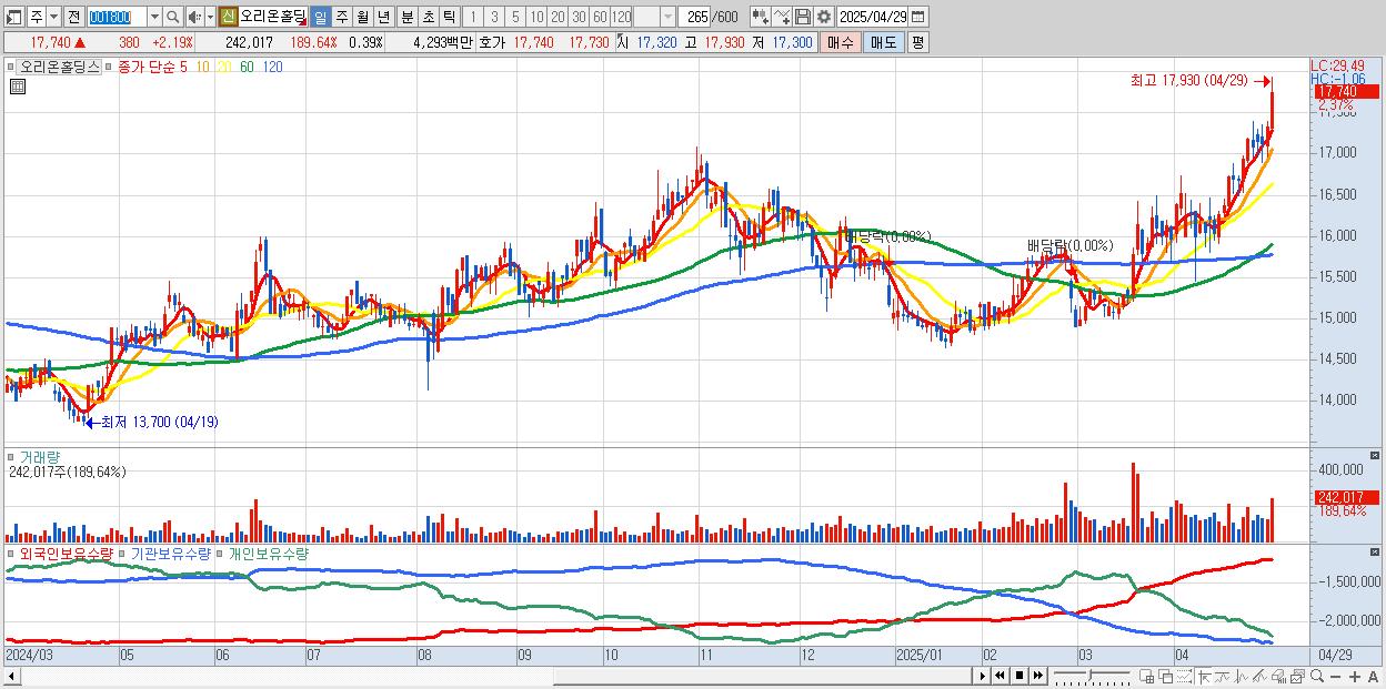 - 오리온홀딩스 (17,780원 ▲ 2.42% , 시총: 11,138억, 거래량: 205,225, 거래대금:36억, KOSPI)