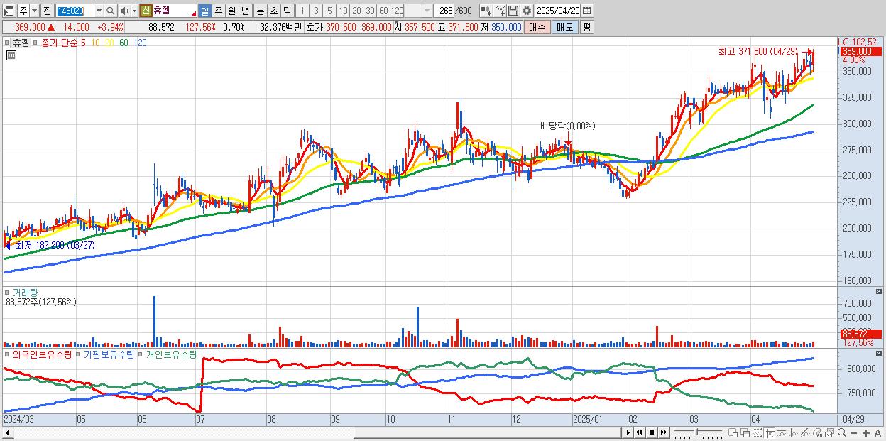 - 휴젤 (370,000원 ▲ 4.23% , 시총: 46,635억, 거래량: 73,627, 거래대금:269억, KOSDAQ)