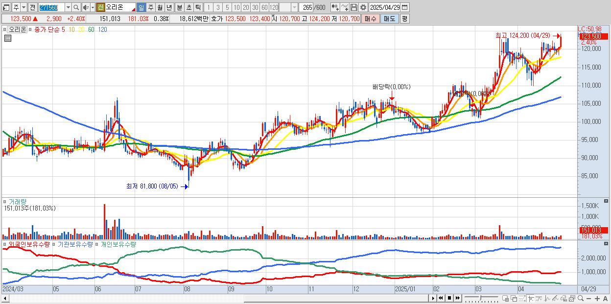 - 오리온 (123,700원 ▲ 2.57% , 시총: 48,906억, 거래량: 129,766, 거래대금:160억, KOSPI)