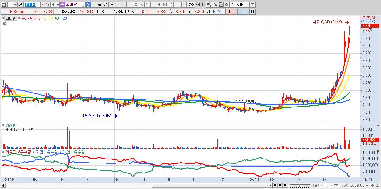 - 코미팜 (6,680원 ▲ 6.03% , 시총: 4,718억, 거래량: 654,763, 거래대금:43억, KOSDAQ)