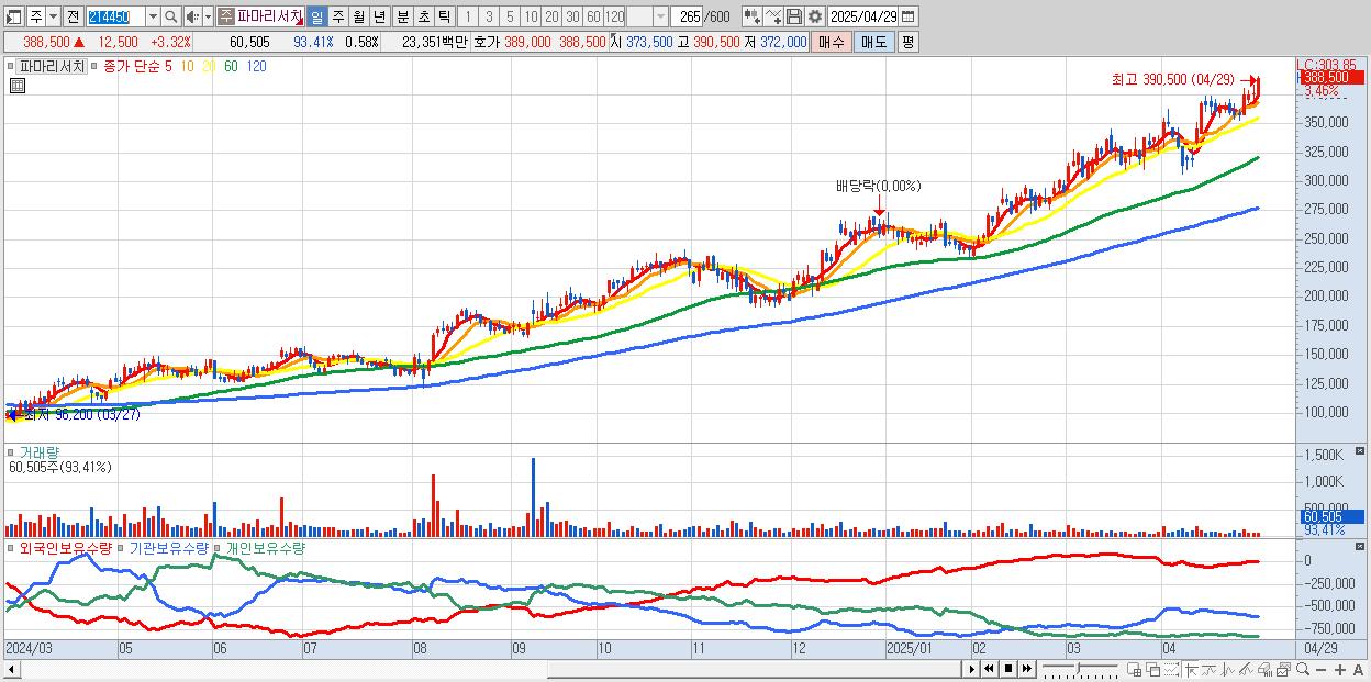 - 파마리서치 (390,000원 ▲ 3.72% , 시총: 40,987억, 거래량: 48,835, 거래대금:189억, KOSDAQ)