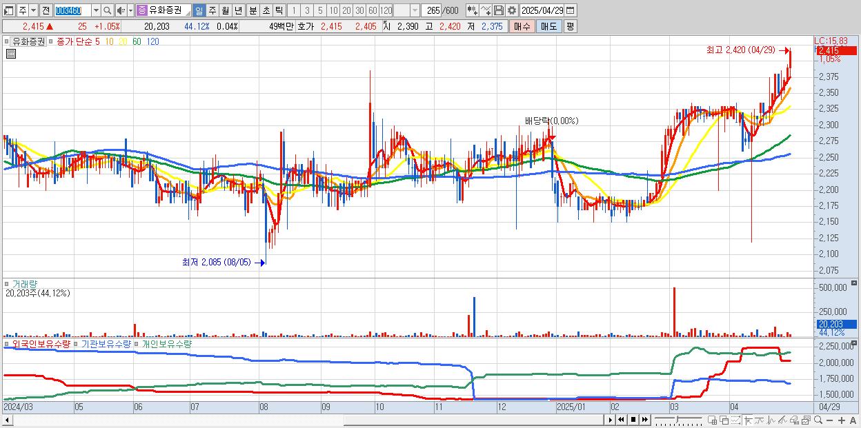 - 유화증권 (2,415원 ▲ 1.05% , 시총: 1,369억, 거래량: 20,203, 거래대금:0억, KOSPI)