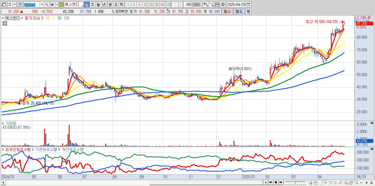 - 에스앤디 (91,200원 ▲ 0.55% , 시총: 2,638억, 거래량: 43,036, 거래대금:39억, KOSDAQ)