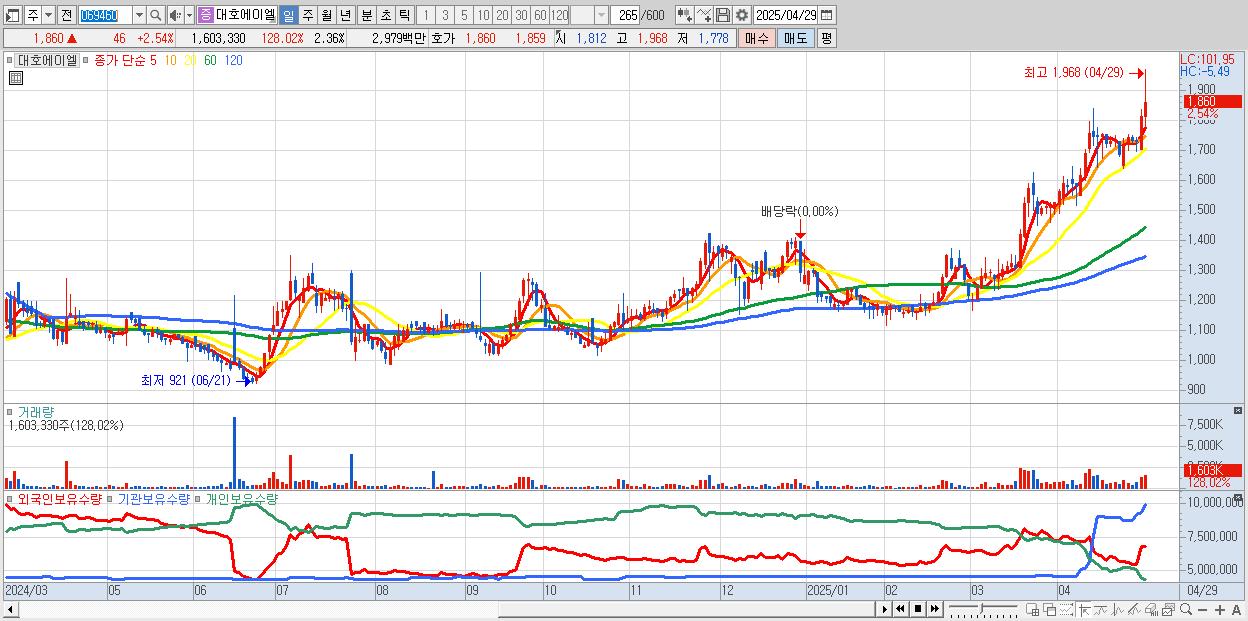 - 대호에이엘 (1,860원 ▲ 2.54% , 시총: 1,262억, 거래량: 1,603,330, 거래대금:30억, KOSPI)