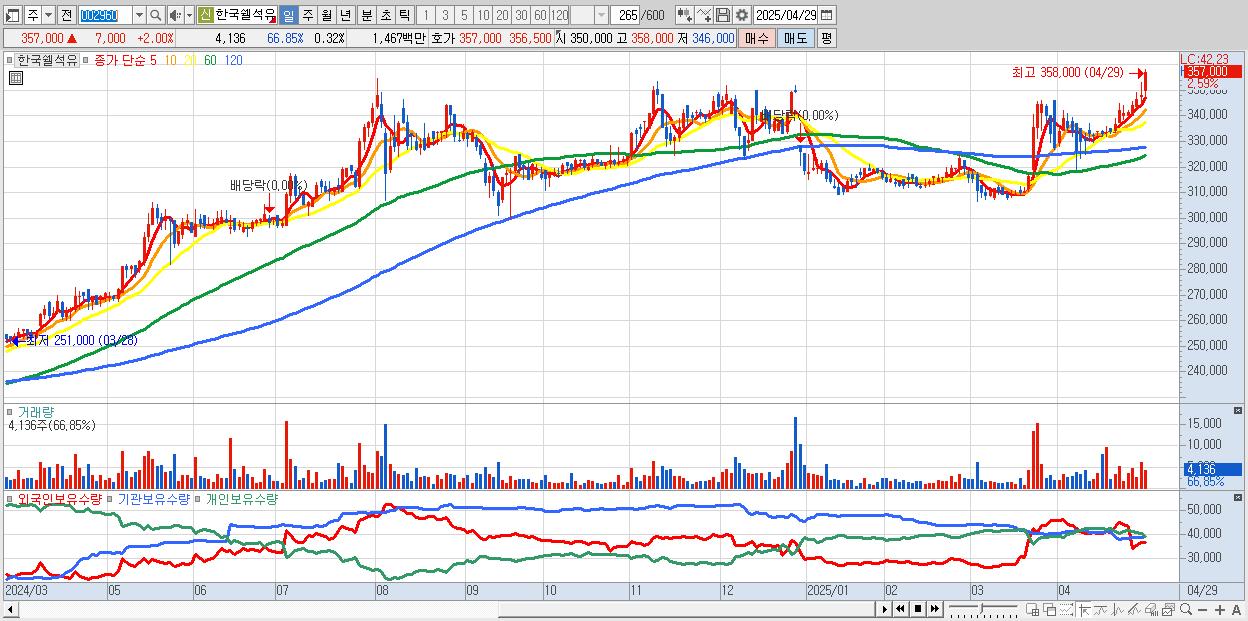 - 한국쉘석유 (358,000원 ▲ 2.29% , 시총: 4,654억, 거래량: 3,273, 거래대금:12억, KOSPI)