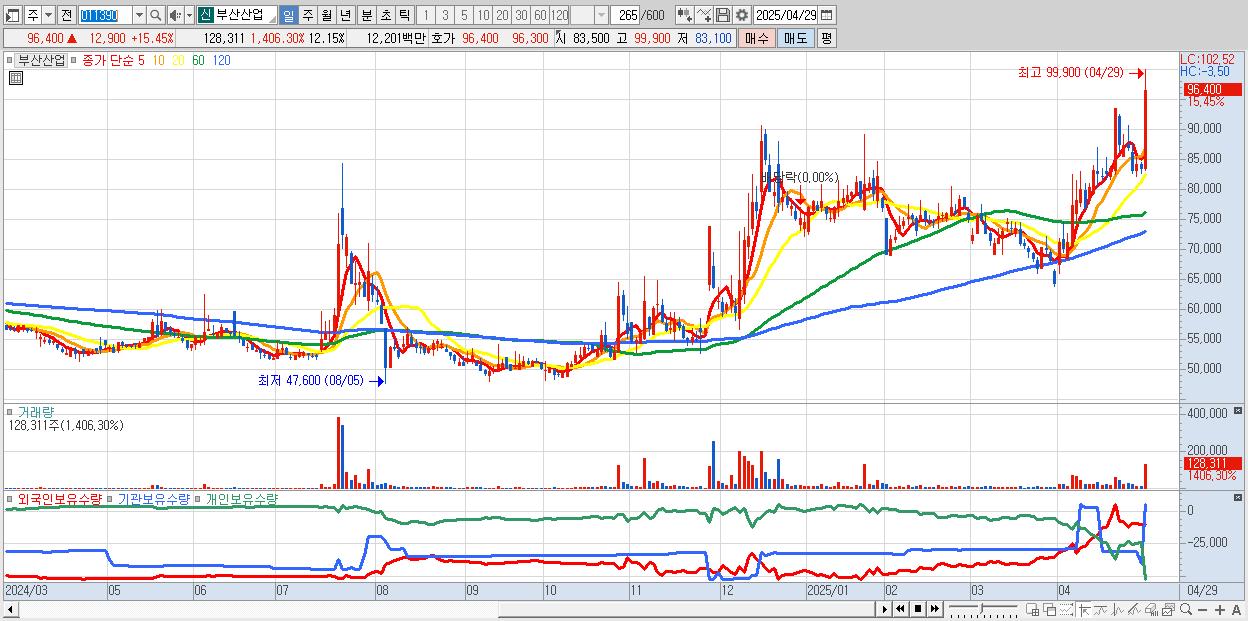 - 부산산업 (96,400원 ▲ 15.45% , 시총: 1,018억, 거래량: 128,311, 거래대금:122억, KOSPI)