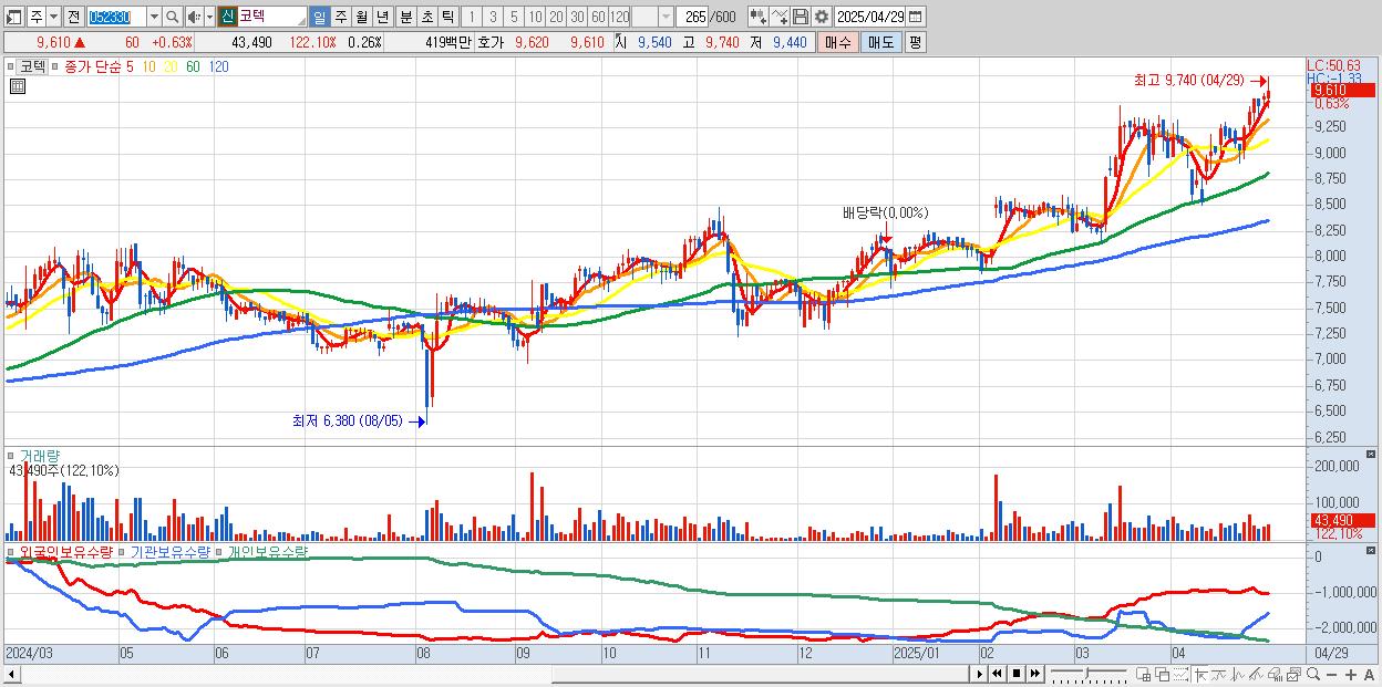 - 코텍 (9,610원 ▲ 0.63% , 시총: 1,588억, 거래량: 43,490, 거래대금:4억, KOSDAQ)