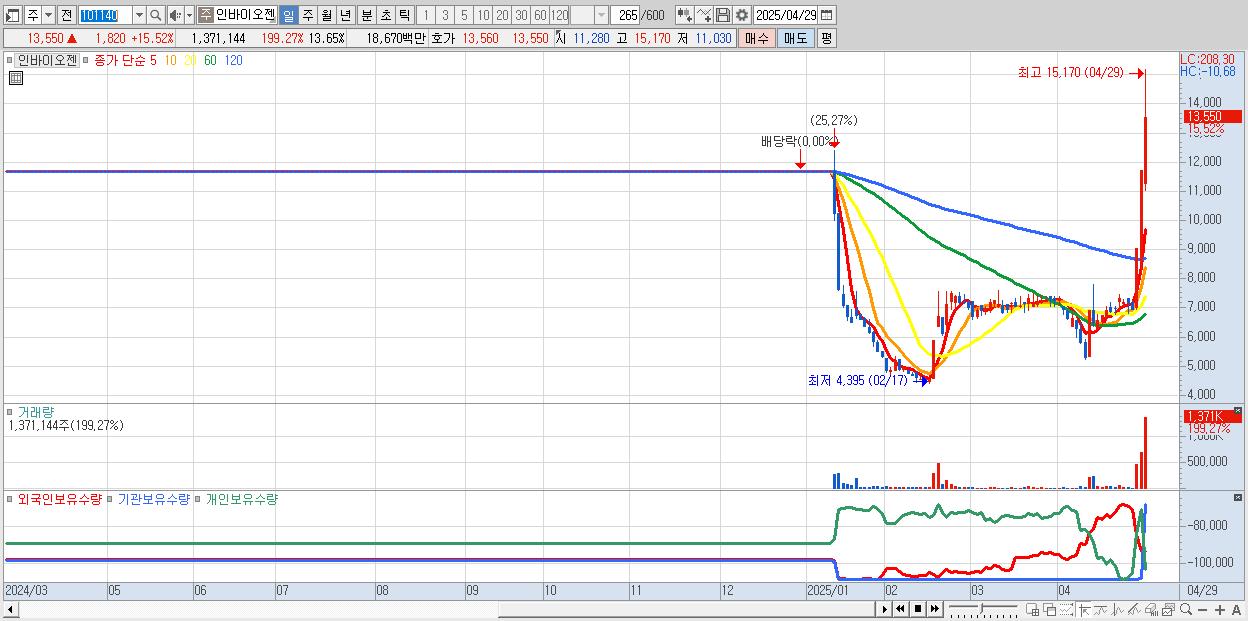 - 인바이오젠 (13,550원 ▲ 15.52% , 시총: 1,361억, 거래량: 1,371,144, 거래대금:187억, KOSPI)