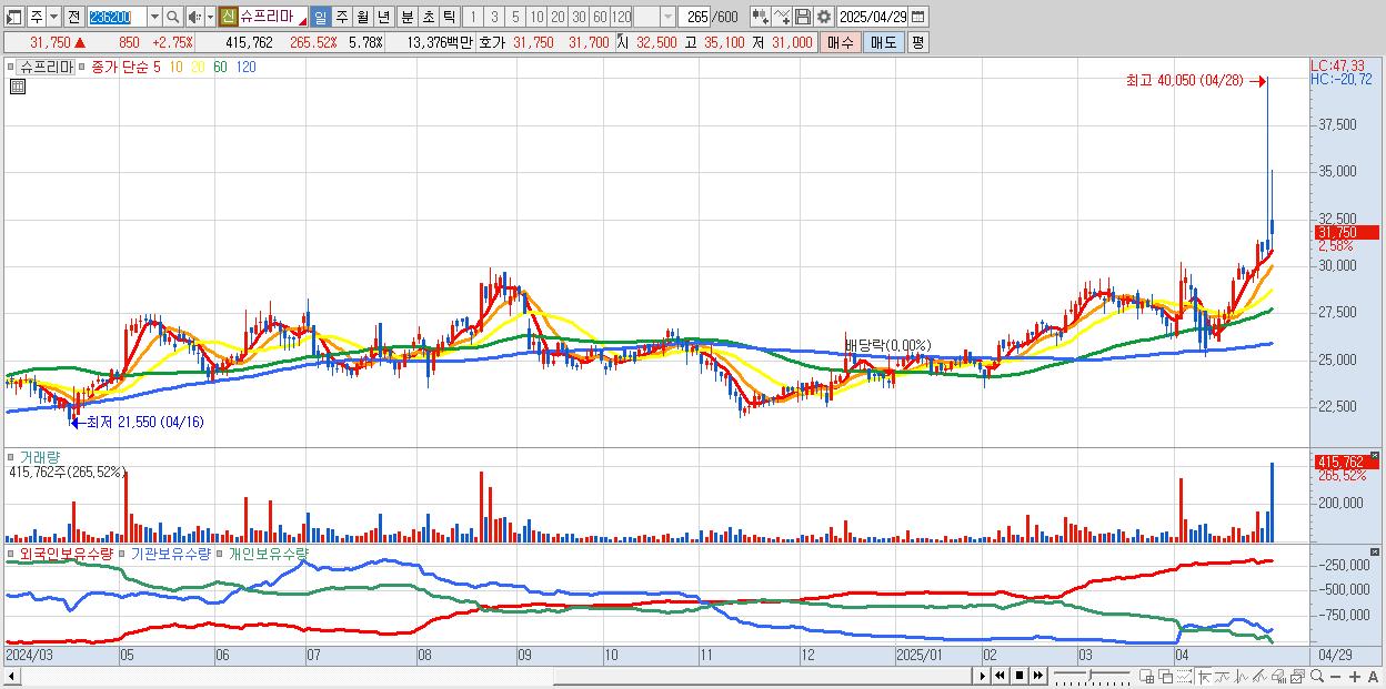 - 슈프리마 (32,650원 ▲ 5.66% , 시총: 2,349억, 거래량: 265,346, 거래대금:85억, KOSDAQ)