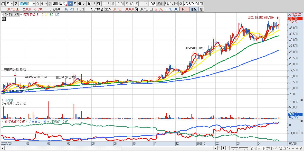 - SNT에너지 (38,850원 ▲ 5.86% , 시총: 8,034억, 거래량: 295,487, 거래대금:112억, KOSPI)