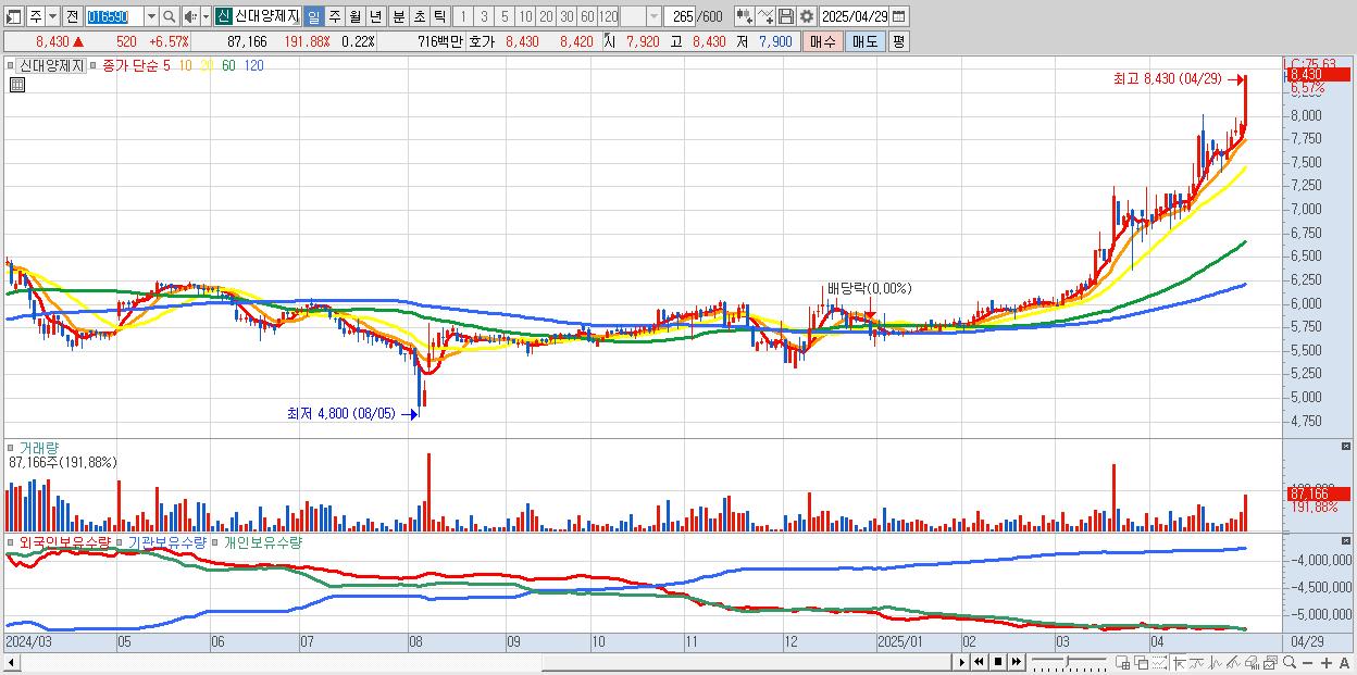 - 신대양제지 (8,430원 ▲ 6.57% , 시총: 3,397억, 거래량: 87,166, 거래대금:7억, KOSPI)