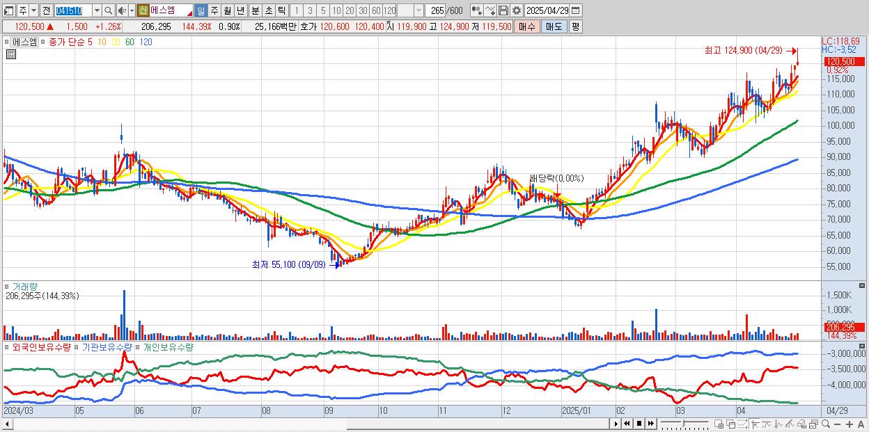 - 에스엠 (120,800원 ▲ 1.51% , 시총: 27,657억, 거래량: 157,616, 거래대금:192억, KOSDAQ)