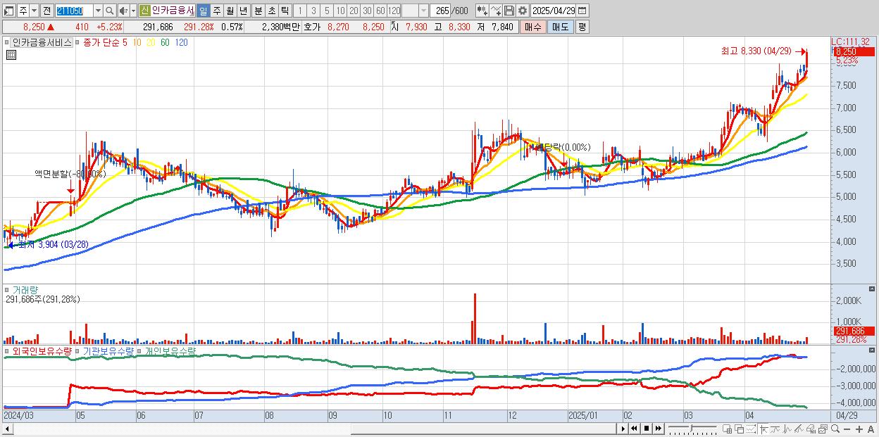 - 인카금융서비스 (8,250원 ▲ 5.23% , 시총: 4,239억, 거래량: 291,686, 거래대금:24억, KOSDAQ)