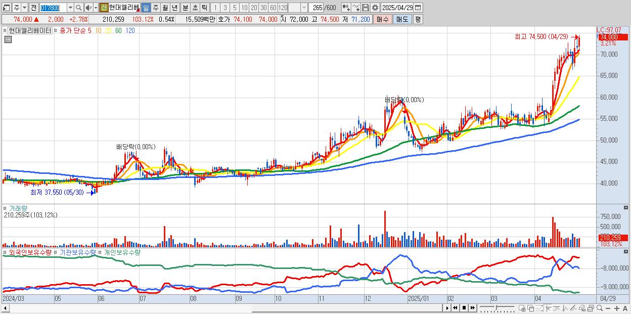 - 현대엘리베이터 (74,100원 ▲ 2.92% , 시총: 28,967억, 거래량: 156,652, 거래대금:116억, KOSPI)