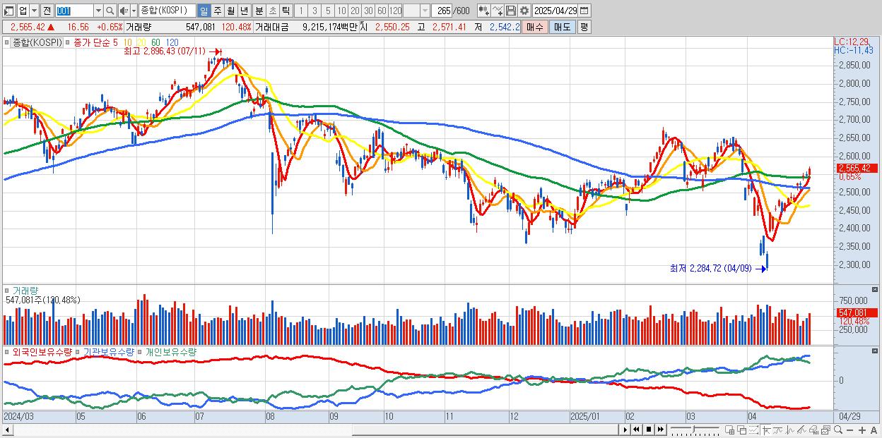 | 04/25 | 2,546.30 | ▲0.95% | -7,741억 | 6,126억 | 5,072억 | -3,457억 |