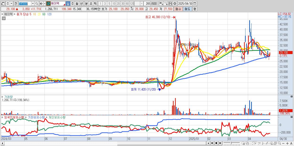 - 에이텍 (29,250원 ▲ 12.28% , 시총: 2,416억, 거래량: 639,987, 거래대금:183억)