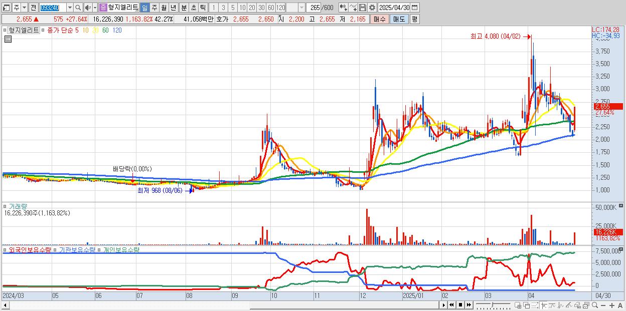 - 형지엘리트 (2,655원 ▲ 27.64% , 시총: 1,019억, 거래량: 16,226,390, 거래대금:411억)