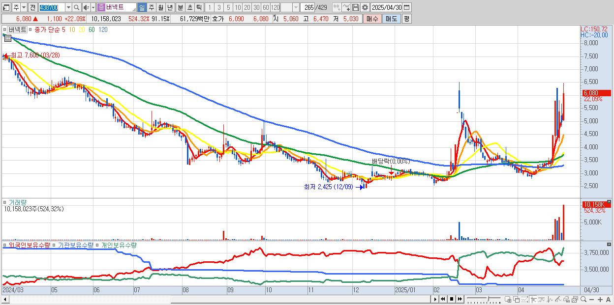 - 버넥트 (6,080원 ▲ 22.09% , 시총: 678억, 거래량: 10,158,023, 거래대금:617억)