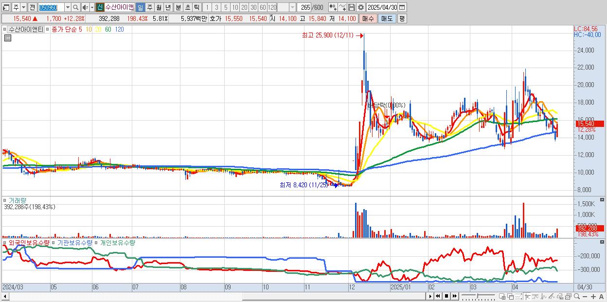- 수산아이앤티 (15,540원 ▲ 12.28% , 시총: 1,049억, 거래량: 392,288, 거래대금:59억)