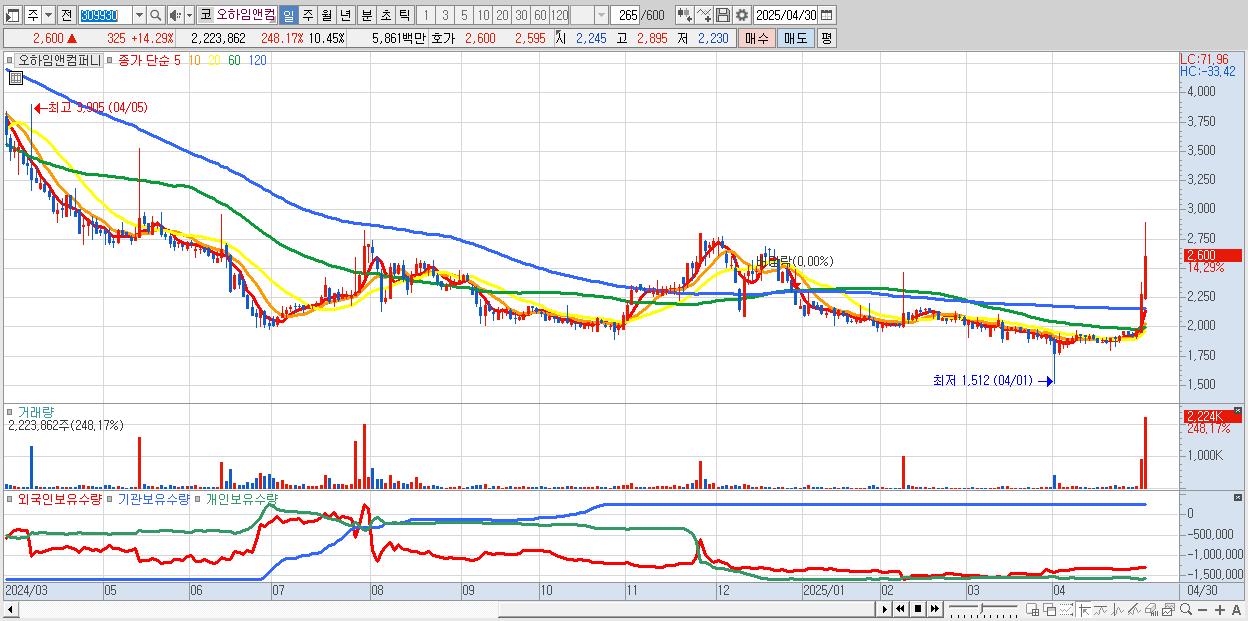 - 오하임앤컴퍼니 (2,600원 ▲ 14.29% , 시총: 554억, 거래량: 2,223,862, 거래대금:59억)