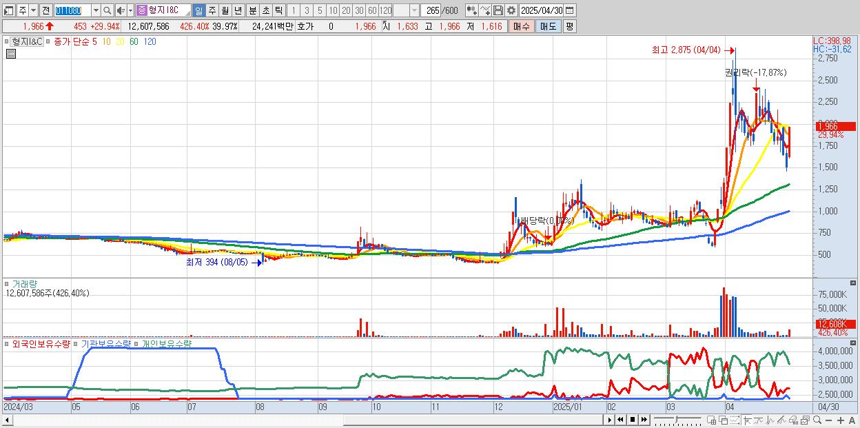 - 형지I&C (1,966원 ▲ 29.94% , 시총: 620억, 거래량: 12,607,586, 거래대금:242억)