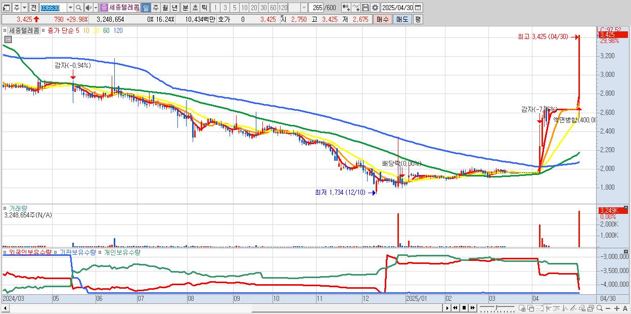 - 세종텔레콤 (3,425원 ▲ 29.98% , 시총: 685억, 거래량: 3,248,654, 거래대금:104억)