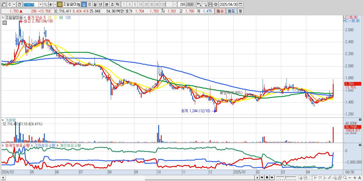 - 조일알미늄 (1,703원 ▲ 13.76% , 시총: 2,157억, 거래량: 32,716,411, 거래대금:550억)