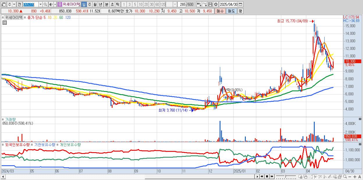 - 위세아이텍 (10,300원 ▲ 9.46% , 시총: 761억, 거래량: 850,838, 거래대금:86억)