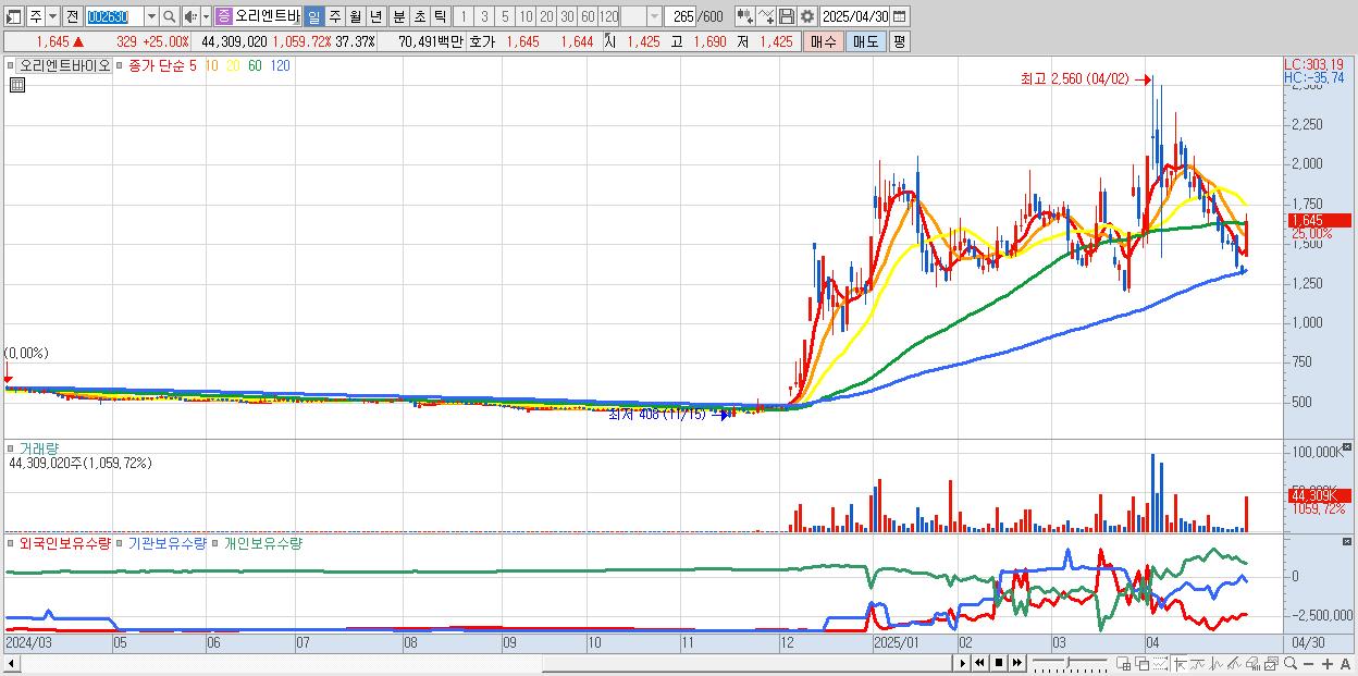 - 오리엔트바이오 (1,645원 ▲ 25% , 시총: 1,951억, 거래량: 44,309,020, 거래대금:705억)