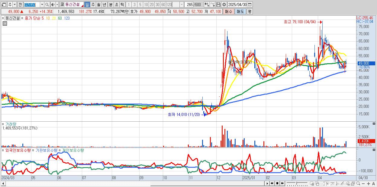 - 동신건설 (51,000원 ▲ 17.11% , 시총: 4,284억, 거래량: 645,533, 거래대금:323억)
