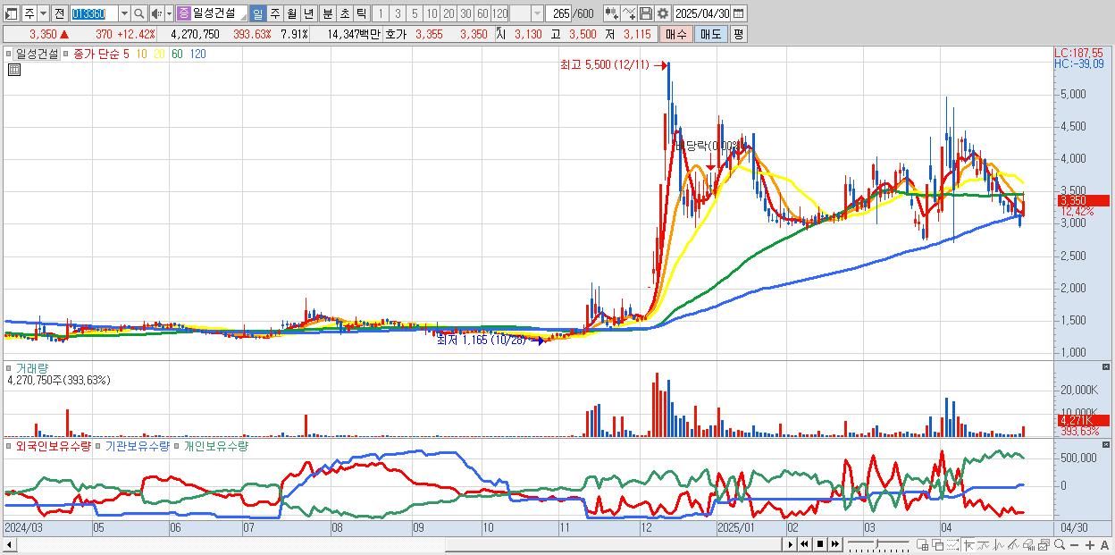 - 일성건설 (3,350원 ▲ 12.42% , 시총: 1,810억, 거래량: 4,270,750, 거래대금:143억)