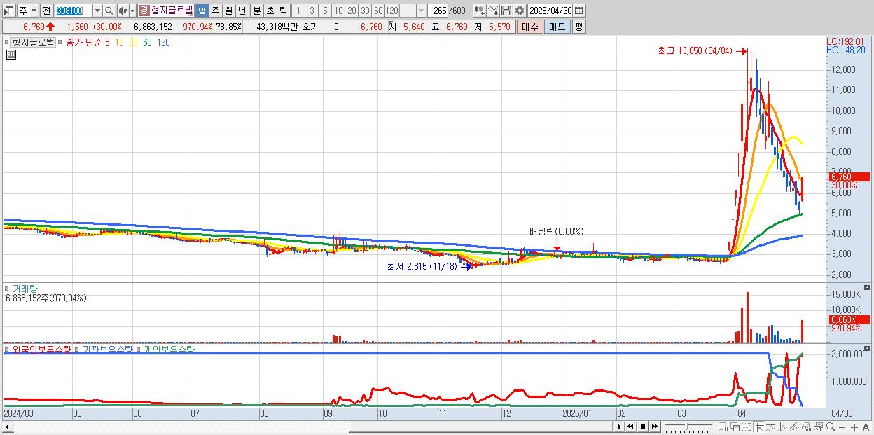 - 형지글로벌 (6,760원 ▲ 30% , 시총: 588억, 거래량: 6,863,152, 거래대금:433억)