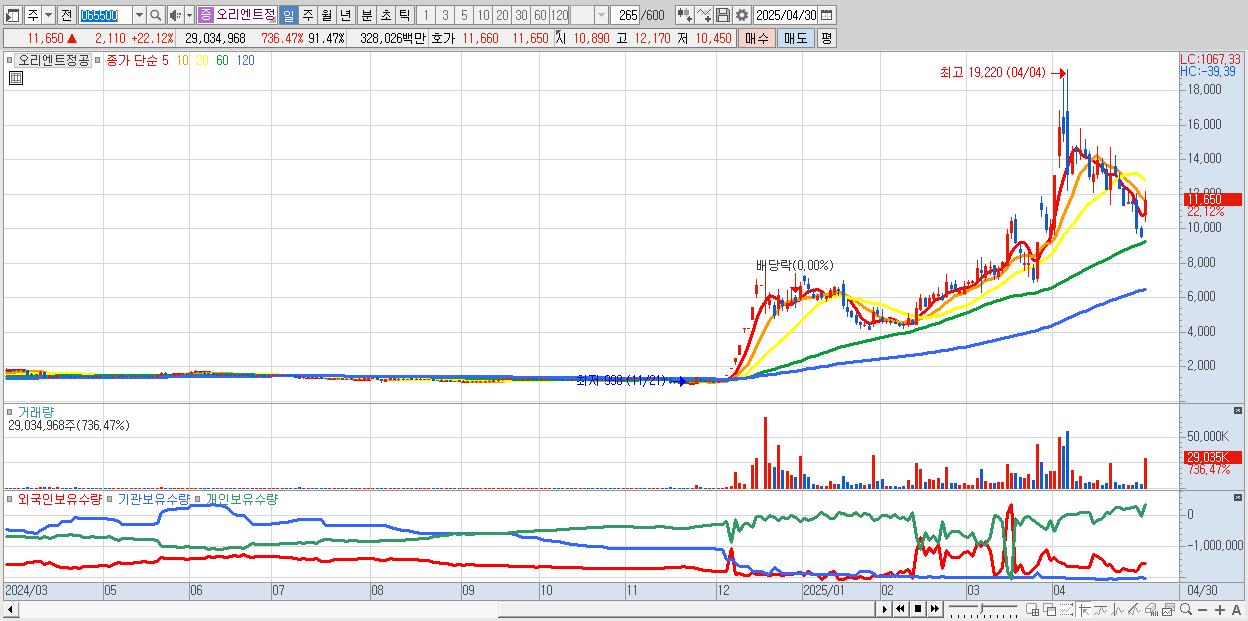 - 오리엔트정공 (11,650원 ▲ 22.12% , 시총: 3,698억, 거래량: 29,034,968, 거래대금:3,280억)