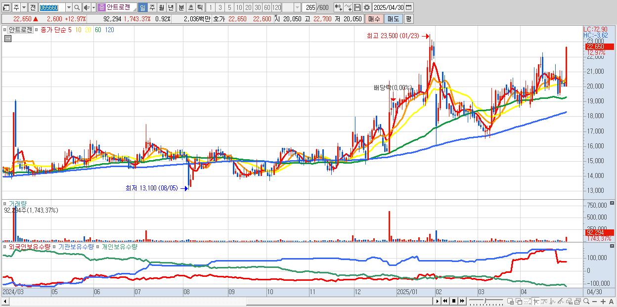 - 안트로젠 (22,650원 ▲ 12.97% , 시총: 2,266억, 거래량: 92,294, 거래대금:20억)