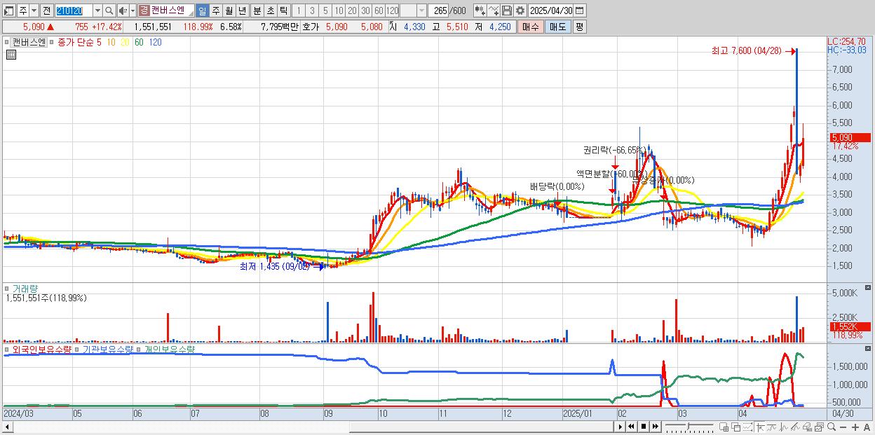 - 캔버스엔 (5,090원 ▲ 17.42% , 시총: 1,200억, 거래량: 1,551,551, 거래대금:78억)
