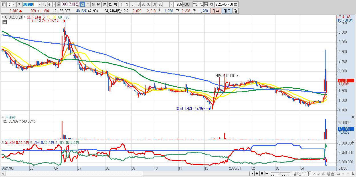 - 아이즈비전 (2,010원 ▲ 11.6% , 시총: 509억, 거래량: 12,135,907, 거래대금:247억)