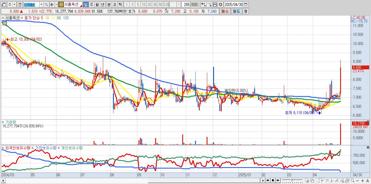 - 서울옥션 (8,860원 ▲ 25.32% , 시총: 1,575억, 거래량: 9,565,574, 거래대금:808억)