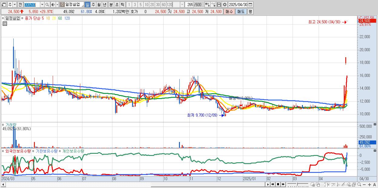 - 일정실업 (24,500원 ▲ 29.97% , 시총: 294억, 거래량: 49,092, 거래대금:12억)