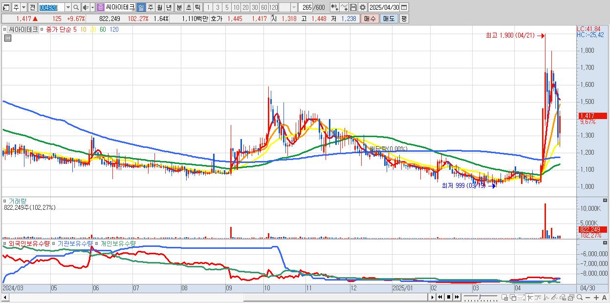 - 씨아이테크 (1,417원 ▲ 9.67% , 시총: 709억, 거래량: 822,249, 거래대금:11억)