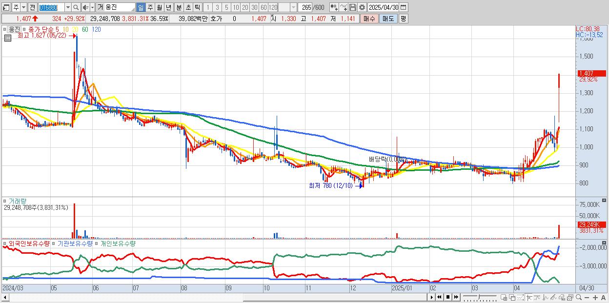 - 웅진 (1,407원 ▲ 29.92% , 시총: 1,125억, 거래량: 29,248,708, 거래대금:391억)