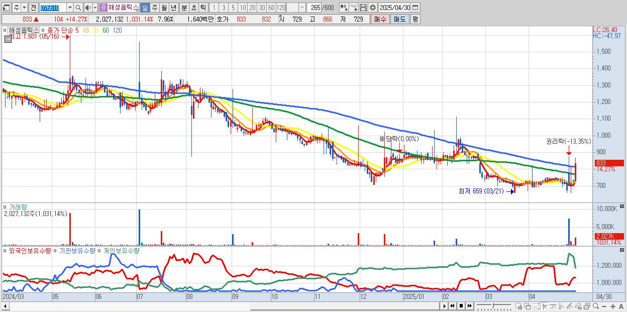 - 해성옵틱스 (833원 ▲ 14.27% , 시총: 212억, 거래량: 2,027,132, 거래대금:16억)